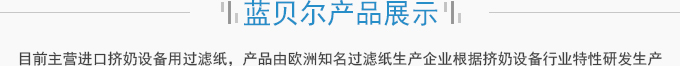濟南藍貝爾工貿有限公司主要產(chǎn)品擠奶設備過濾紙,牛奶過濾紙,擠奶機過濾袋,目前主營進口擠奶設備用過濾紙,產(chǎn)品由歐洲知名過濾紙生產(chǎn)企業(yè)根據(jù)擠奶設備行業(yè)特性研發(fā)生產(chǎn),產(chǎn)品符合歐盟食品接觸標準及FDA食品接觸標準,產(chǎn)品在擠奶設備過濾紙行業(yè)占有70%以上的份額。并通過了SGS標準技術檢測中心按國標食品級標準進行的檢測。產(chǎn)品適用于各種擠奶設備品牌,本公司目前獲得該區(qū)域產(chǎn)品營銷資格。產(chǎn)品已用于國內各大乳企所屬牧...